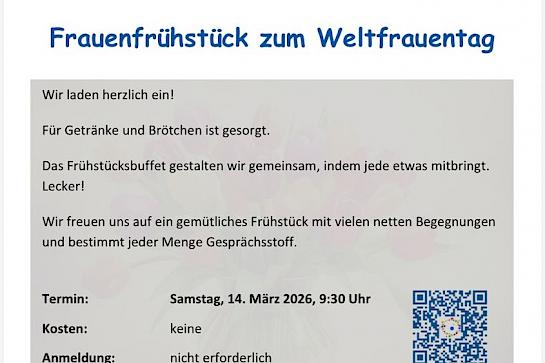 Am Samstag, 14.03.2026 findet ab 9:30 Uhr das Frauenfrühstück zum Weltfrauentag statt.